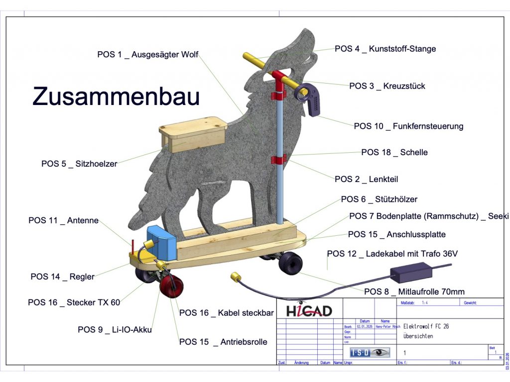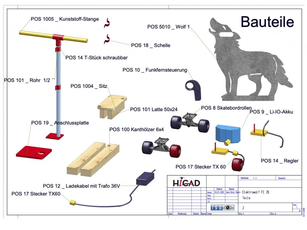 Wir bauen dazu einen Elektro-Leitwolf aus Ersatzteilen eines Elektro Skateboards und einer 36V Lithium-Ionen Batterie.. Es gibt verschiedene Aussägeformen von Klein bis Groß – also bitte Stichsäge und Akkuschrauber mitbringen. Das Ladegerät, die Steuereinheit und der Motor ist alles steckbar – es muss nichts gelötet werden .. Der alte Spruch „Kinder betet- der Vater lötet“ kommt 2026 nicht vor – nur einstecken und festschrauben.