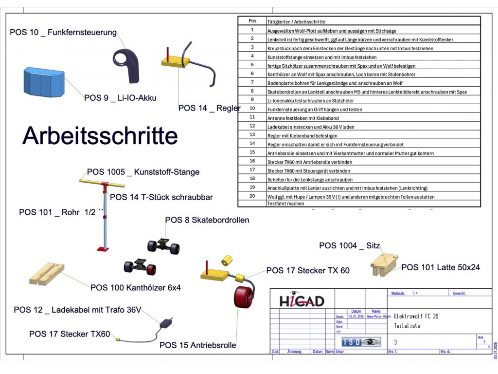 Der Wolf wird ausgesägt, Latten seitlich angeschraubt, die fertigverschweißte Lenkstange eingesetzt und die Elektroeinheit eingesteckt – fertig. Der Wolf fährt auch ohne Elektrobausatz – wer darauf verzichtet bekommt 50,- € zurück. Man kann auch mehrere Wölfe aussägen, weitere Elektrorollen aber kosten 100.- € zusätzlich – die sind sehr teuer.